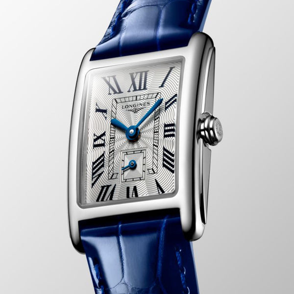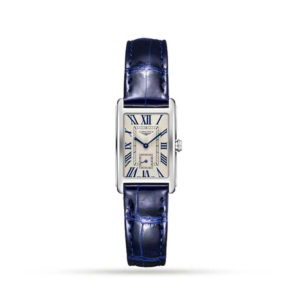 Ladies Longines Dolce Vita Quartz Watch. The 32mm case is stainless steel with a blue alligator strap. The dial is silver flinque with black roman numerals and blue hands and a second hand sub-dial. The glass is sapphire crystal and the movement is quartz. Currently out of stock but available to order.