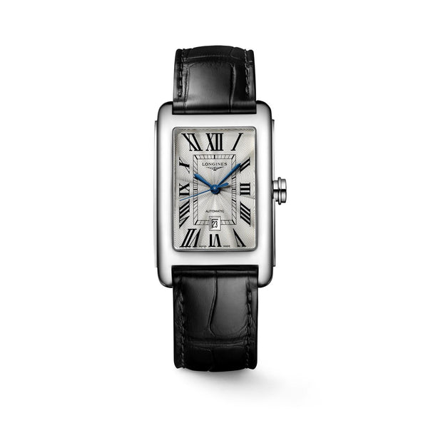 Gent's Longines Dolce Vita Automatic Watch. The 43 x 27mm case is stainless steel and the strap is black alligator leather. The dial is cream with black roman numerals and blue hands. The glass is sapphire crystal. The movement is automatic. Currently out of stock.
