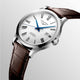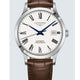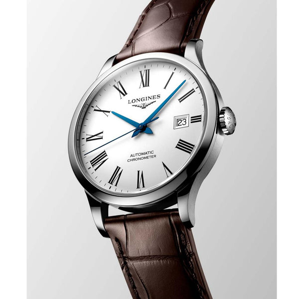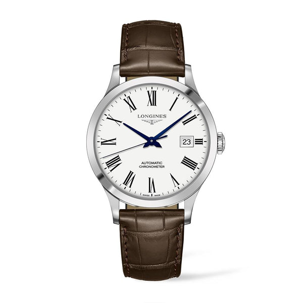 Gents Longines Record Chronometer. The 40mm case is stainless steel with a brown alligator strap. The dial is white and the glass is sapphire crystal. The watch features a transparent case back with sapphire crystal. The movement is a COSC certified automatic chronometer.