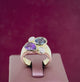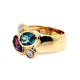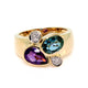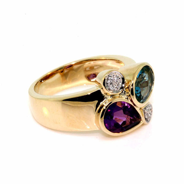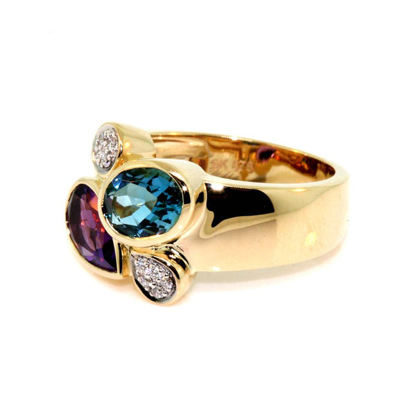9k yellow gold ring set with one 1ct pear shape amethyst, one 1.3ct oval London blue topaz and 0.05cts of round brilliant cut diamonds, GH colour, SI clarity. Currently out of stock.