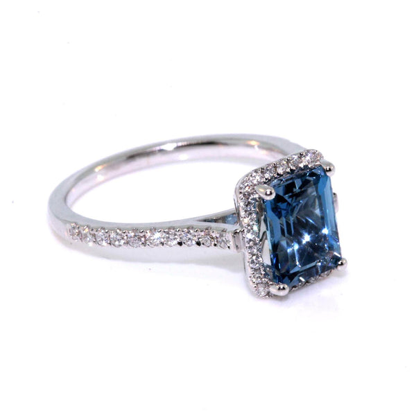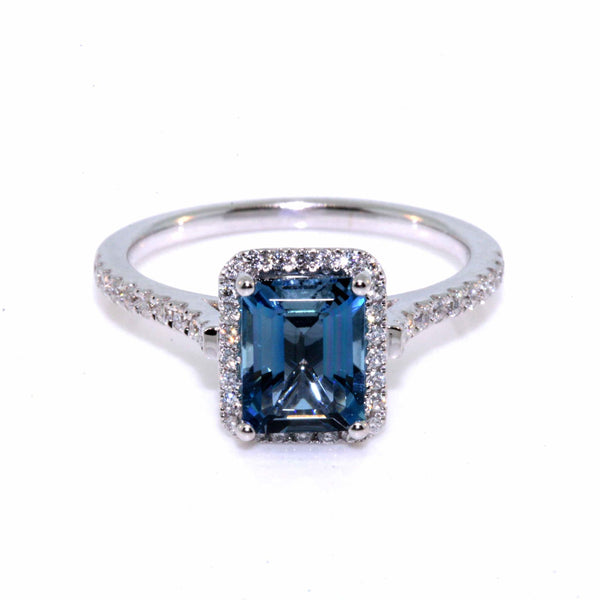 18k white gold aqaumarine and diamond halo, set with a 1.25ct intense colour aquamarine, and 0.28cts of round brilliant cut diamonds, FG/VS-SI. This ring is made to order in the required finger size.