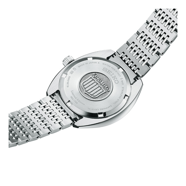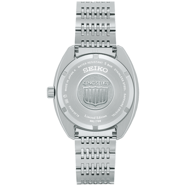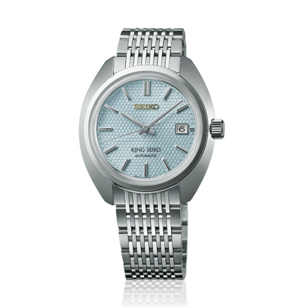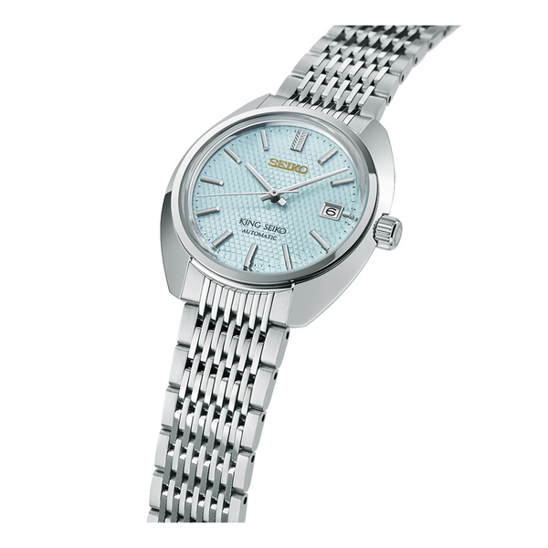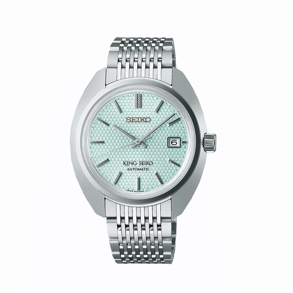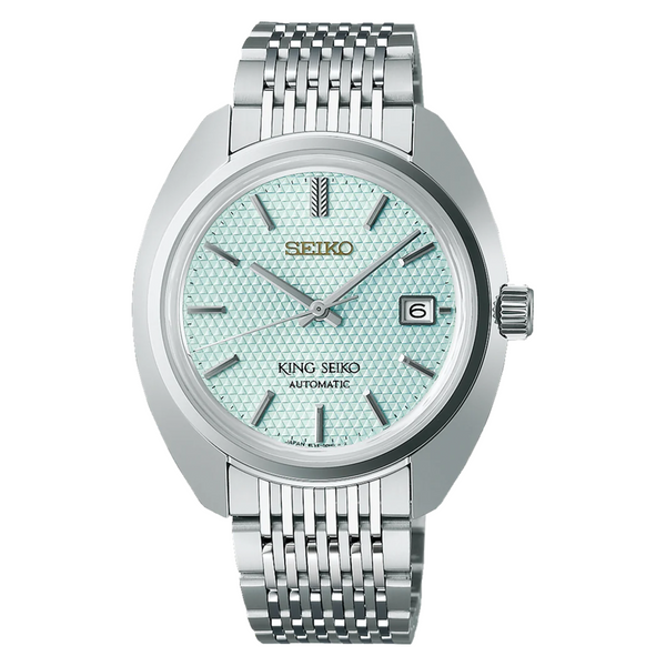Gents King Seiko Automatic Watch Limited Edition 100th Anniversary Rising Dragon. The 39.4mm case and bracelet are stainless steel with textured aqua coloured dial. The case shape is based on the King Seiko 45KCM from 1969, whose characteristically curved silhouette inspired the design of other King Seiko creations that followed. The new King Seiko series adopts the contours of the 1969 watch but reimagines them for modern times. The movement is a calibre 6L35 automatic. Limited to 700 pieces worldwide.