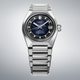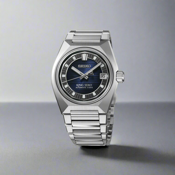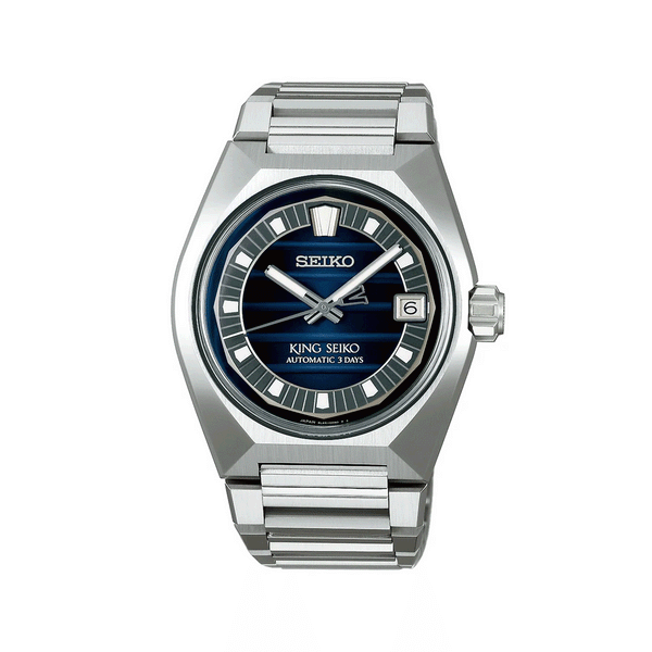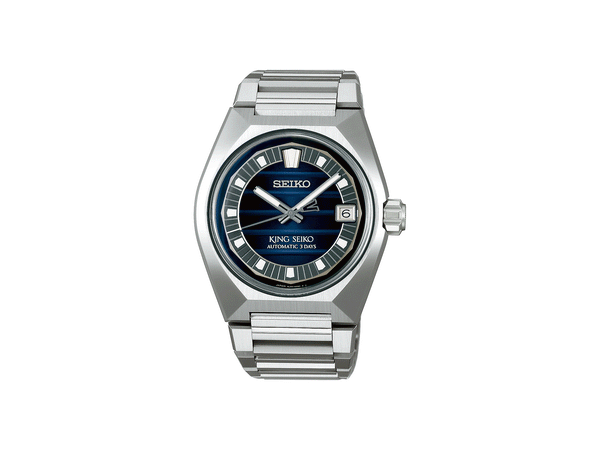 Gent's King Seiko VANAC Automatic Watch. The 41mm case and bracelet are stainless steel. The dial is blue with stripe pattern and a date function. The glass is a box shaped sapphire crystal. The watch has a see-through case back and is 100m water resistant. The movement is a Calibre 8L45 Automatic 3 Days. Three year Seiko international warranty.
