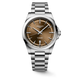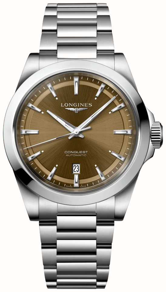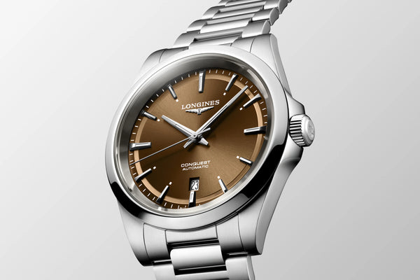 Gent's Longines Conquest Automatic Watch. The 41mm case and bracelet are stainless steel. The dial is brown with a date function and the glass is sapphire crystal. The case back is transparent with a sapphire crystal glass. The watch is 100m water resistant. The movement is automatic.