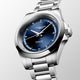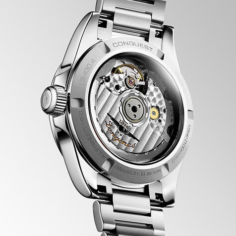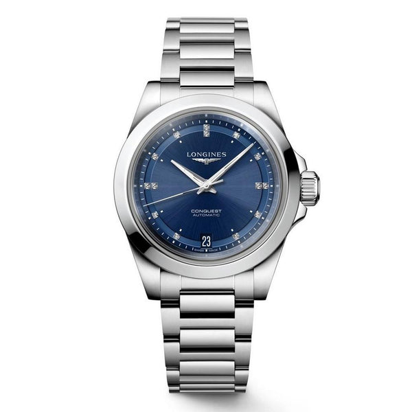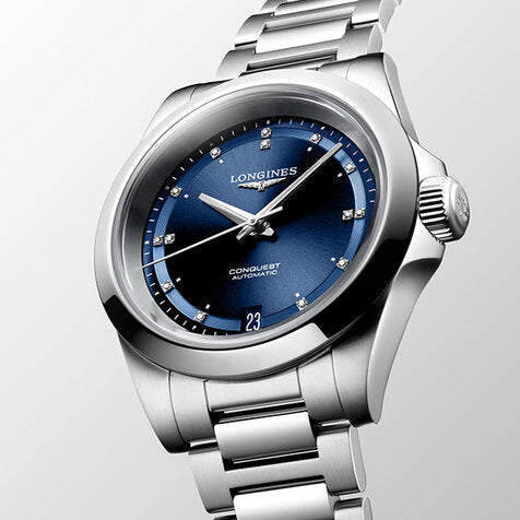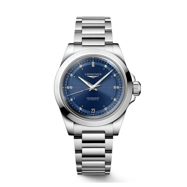 Ladies Longines Conquest Automatic Watch. The 34mm case and bracelet are stainless steel. The dial is blue with 14 diamond set hour markers. The glass is sapphire crystal. The case back is transparent with a sapphire crystal glass. The watch is 100m water resistant and has a date function. The movement is automatic.