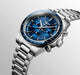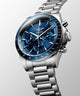 Gent's Longines Conquest Chronograph Automatic Watch. The 42mm case and bracelet are stainless steel. The bezel is blue ceramic with a tachymeter scale and the dial is blue. The glass is sapphire crystal and the case back is transparent with a sapphire crystal glass. The watch features a chronograph function and is 100m water resistant. The movement is automatic.