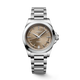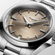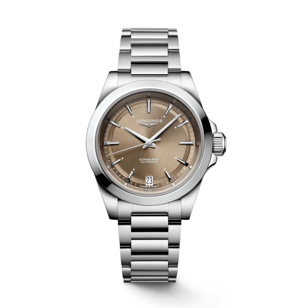 Ladies Longines Conquest Automatic Watch. The 34mm case and bracelet are stainless steel. The dial is brown with a date function and the glass is sapphire crystal. The case back is transparent with a sapphire crystal glass. The watch is 100m water resistant. The movement is automatic.