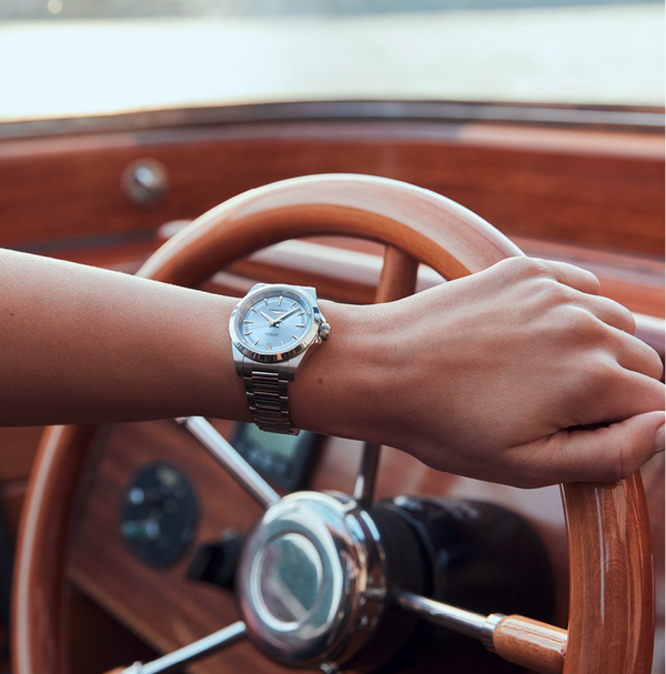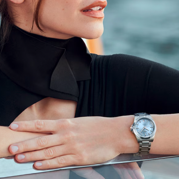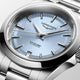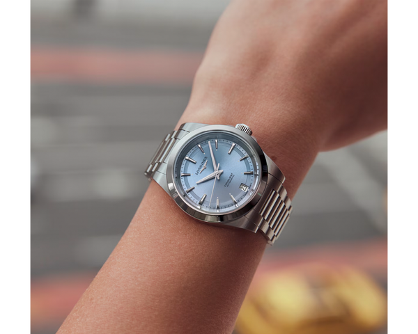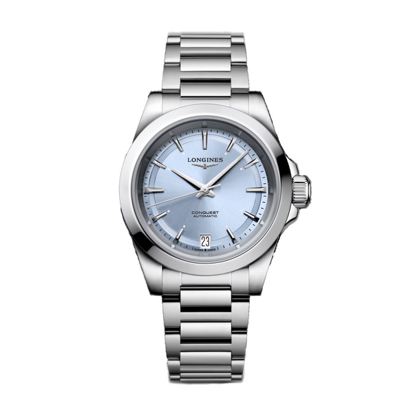 Ladies' Longines Conquest Automatic Watch. The 34mm case and bracelet are stainless steel. The dial is pastel-blue with a date function and the glass is sapphire crystal. The case back is transparent with a sapphire crystal glass. The watch is 100m water resistant. The movement is automatic.