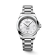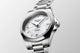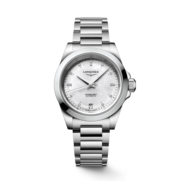 Ladies Longines Conquest Automatic Watch. The 34mm case and bracelet are stainless steel. The dial is white mother-of-pearl with 14 diamond set hour markers. The glass is sapphire crystal. The case back is transparent with a sapphire crystal glass. The watch is 100m water resistant and has a date function. The movement is automatic.