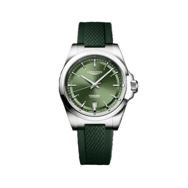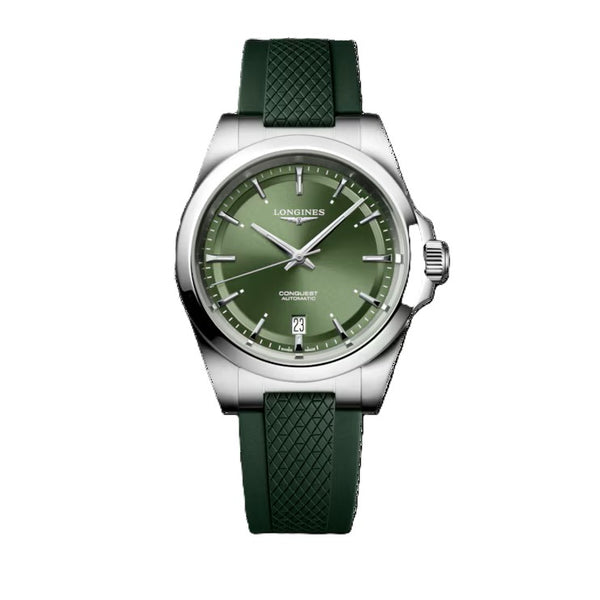 Gent's Longines Conquest Automatic Watch. The 38mm case is stainless steel with a green rubber strap and deployment clasp. The dial is green with a date function and the glass is sapphire crystal. The case back is transparent with a sapphire crystal glass. The watch is 100m water resistant. The movement is automatic.