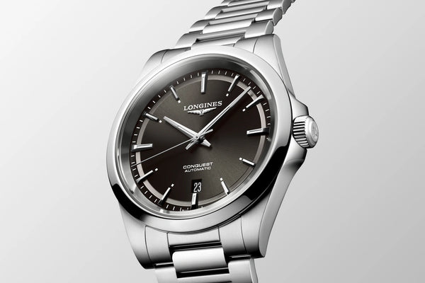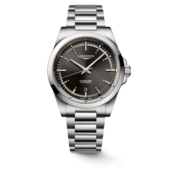Gent's Longines Conquest Automatic Watch. The 41mm case and bracelet are stainless steel. The dial is black with a date function and the glass is sapphire crystal. The case back is transparent with a sapphire crystal glass. The watch is 100m water resistant. The movement is automatic. Currently out of stock.