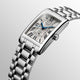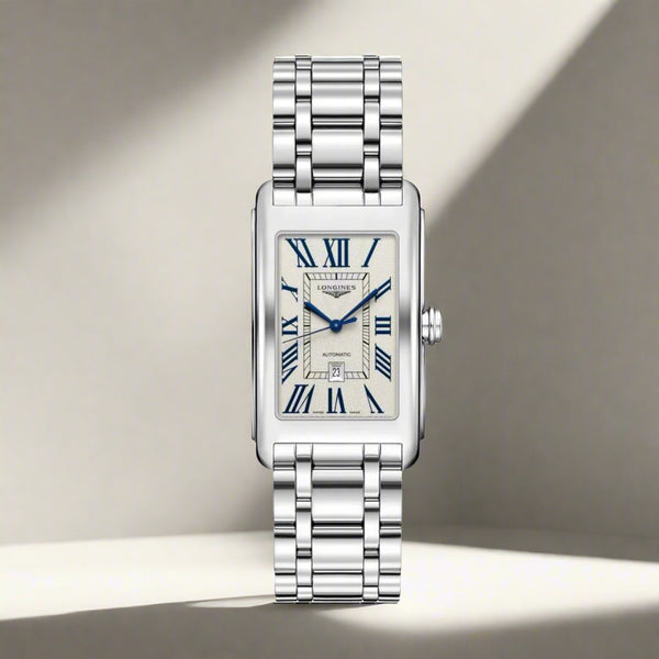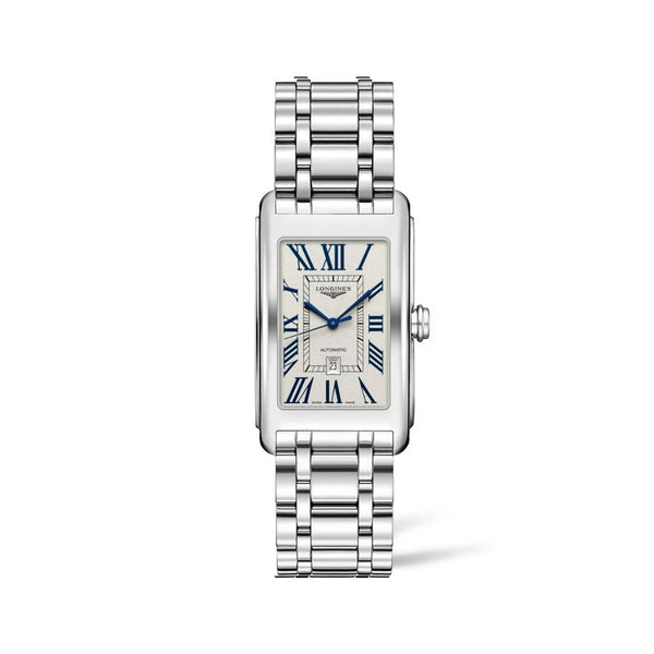 Longines Dolce Vita Automatic Watch. The 28.2 x 47mm rectangular case and bracelet are stainless steel. The dial is silver "flinque" with black roman numerals and blue hands. The glass is sapphire crystal. The watch has a date function. The movement is automatic.