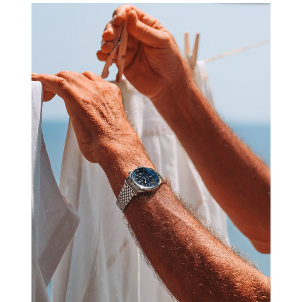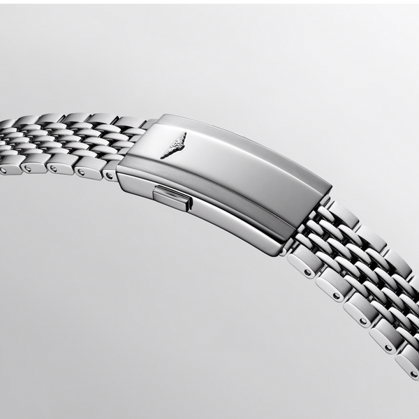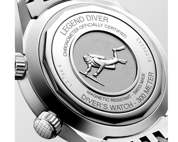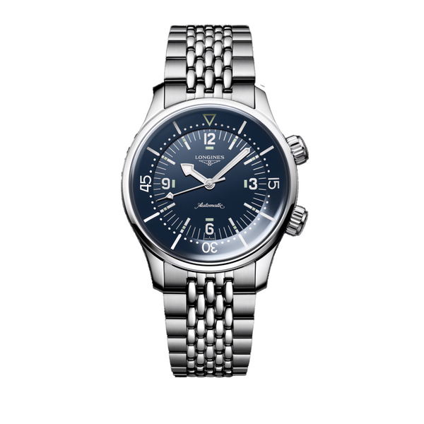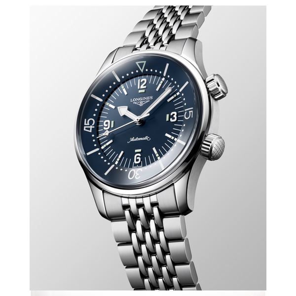 Gents Longines Heritage Collection Legend Diver Automatic Chronometer Watch. The 39mm case and bracelet are stainless steel. The dial is blue with Arabic numerals and indexes. The glass is sapphire crystal. The watch features an internal rotating diving flange and has two crowns. The watch is 300m water resistant. The movement is an automatic
