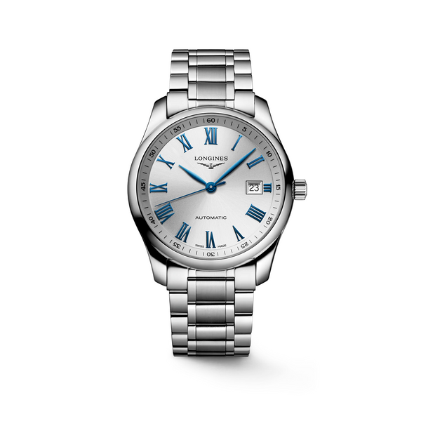 Gents Longines Master Collection Automatic Watch. The 40mm case and bracelet are stainless steel. The dial is silver with blue coloured roman numerals and the glass is sapphire crystal. The watch features a date function and a transparent sapphire crystal case back. The movement is automatic.