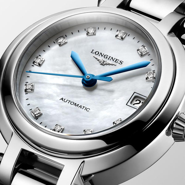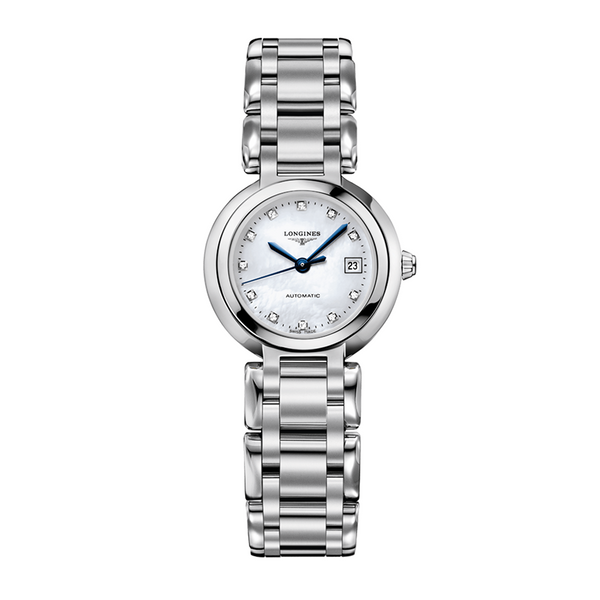 Longines Prima Luna Automatic Watch. The 26.5mm case and bracelet are stainless steel, the dial is white mother of pearl with diamond set hour markers and blue hands. The glass is sapphire crystal. The movement is automatic. Currently out of stock.
