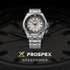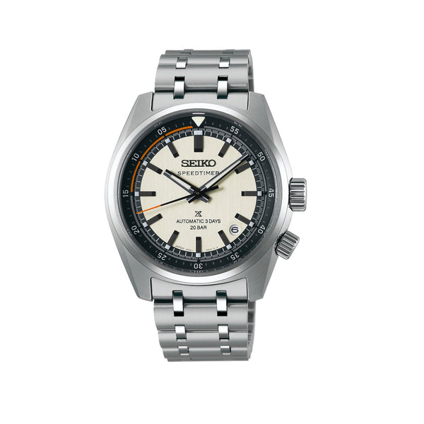 Gent's Speedtimer Automatic Watch. The 39.5mm case and bracelet are stainless steel. The dial is cream with a date function. The watch has a countdown timer function with a rotating inner ring. The glass is a curved sapphire crystal. The watch has a see-through case back and is 200 metres water resistant. The movement is automatic.