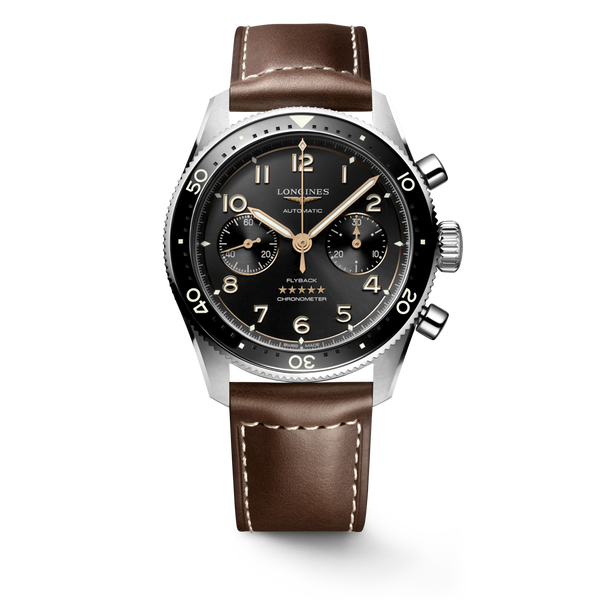 Gents Longines Spirit Flyback Chronograph Watch. The 42mm case is stainless steel and the strap is brown leather with a deployment clasp. The bezel is black ceramic. The dial is sunray black with arabic numerals and two sub-dials. The glass is sapphire crystal, and the case back is a transparent sapphire crystal glass. The watch features a Flyback Chronograph function and is 100m water resistant. The movement is an automatic chronometer. Currently out of stock but available to order.