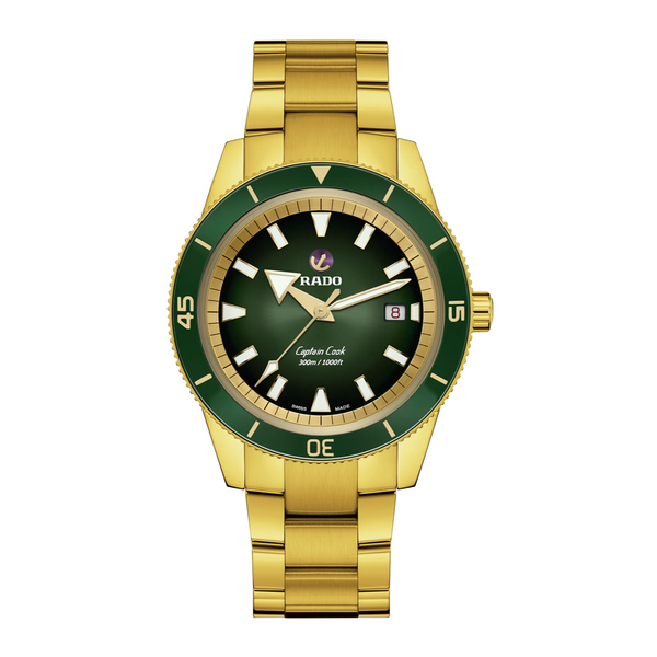 Gent's Rado Captain Cook Automatic Watch. The 42mm case and bracelet are yellow gold PVD on stainless steel. The bezel is green high tech ceramic and the dial has a green to black gradient colour. The glass is sapphire crystal. The watch has a date function and is 300 metres water resistant. The movement is automatic. Currently out of stock.