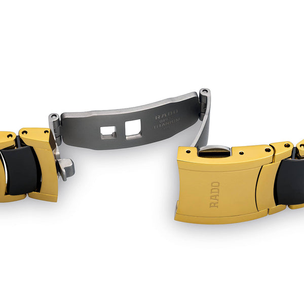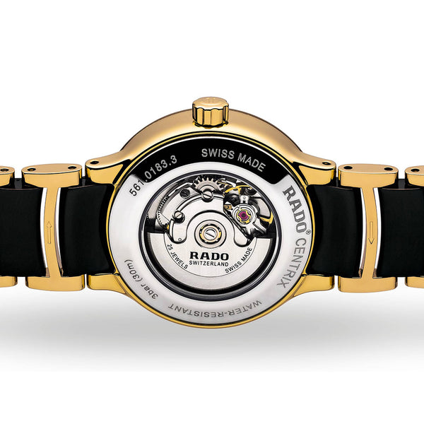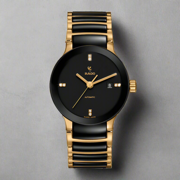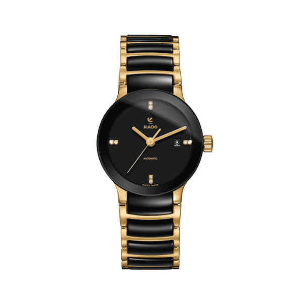 Ladies Rado Centrix Diamond Set Automatic Watch. The 28mm case and bracelet are bicolour: yellow gold plated stainless steel and black high-tech ceramic. The dial is black and the glass is sapphire crystal. The watch features a diamond set dial and a date function. The movement is automatic. Currently out of stock.