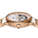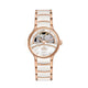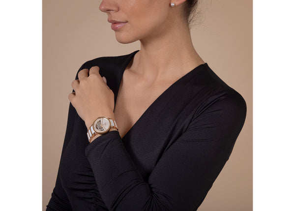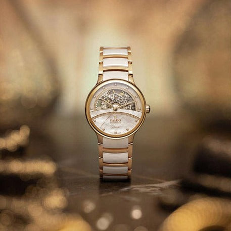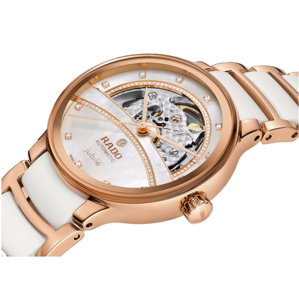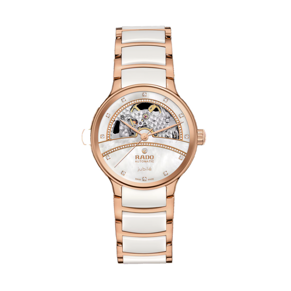 Rado Centrix Open Heart Diamonds Automatic Watch. The 35mm case is rose gold PVD on stainless steel. The bracelet is bicolour: rose gold PVD on stainless steel with white high tech ceramic middle links. The top of half of the dial is a large open window revealing the movement and the lower half is white mother-of-pearl. The dial has two diamond set arches and twelve diamond hour markers. The glass is sapphire crystal and case back is transparent sapphire crystal glass. The movement is automatic.