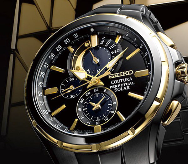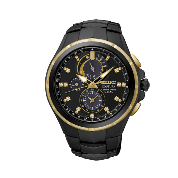 Gent's Seiko Coutura Solar Chronograph Watch. The case and bracelet are black hard coated stainless steel with bicolour yellow gold plated/black bezel, the dial is black and the glass is sapphire crystal. The watch features a diamond set dial.