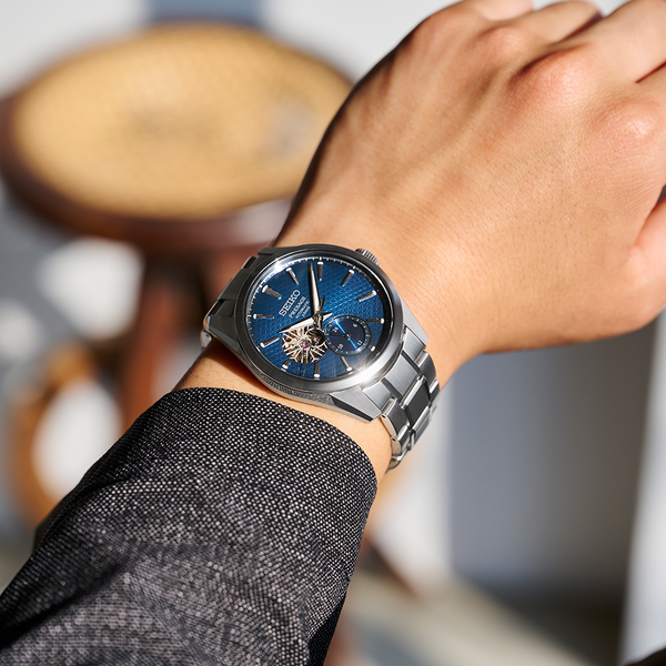 Gents Seiko Presage Sharp Edged Series Automatic Watch. The 40.2mm case and bracelet are stainless steel. The dial is blue with a hemp-leaf pattern, 24 hour indicator sub-dial and circlular shaped movement window. The watch has a sapphire crystal glass with a see-trhough case back and is 100m water resistant. The movement is automatic with a 3 day power reserve.