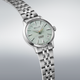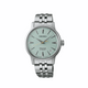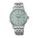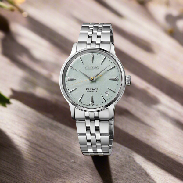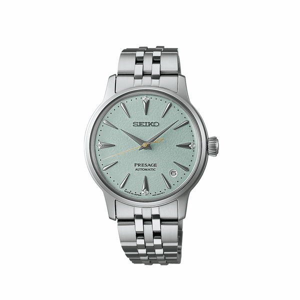 Ladies' Seiko Presage Cocktail Time Automatic Watch. The 34mm case and bracelet are stainless steel. The dial is mint green with a textured finish and four diamond set hour markers. The watch has a date function. The movement is automatic.