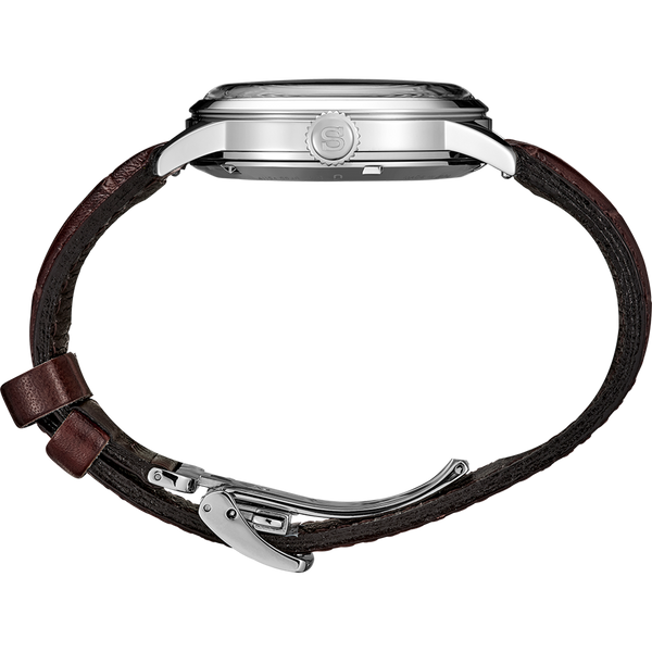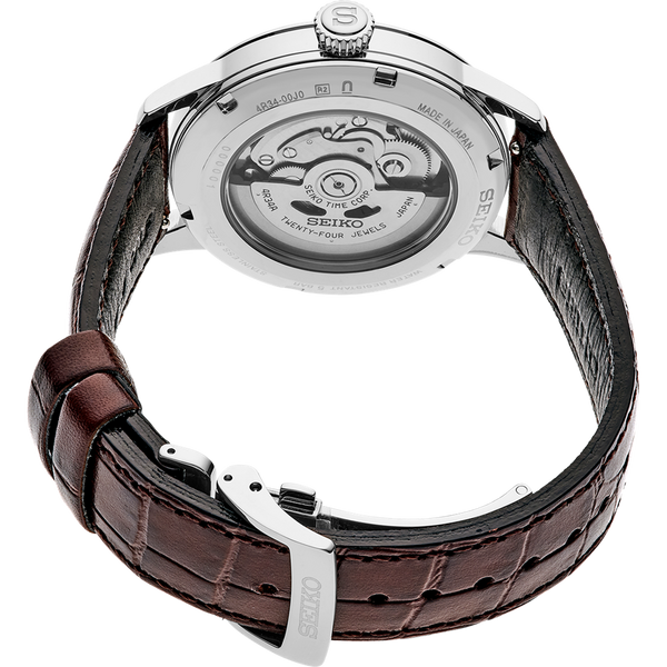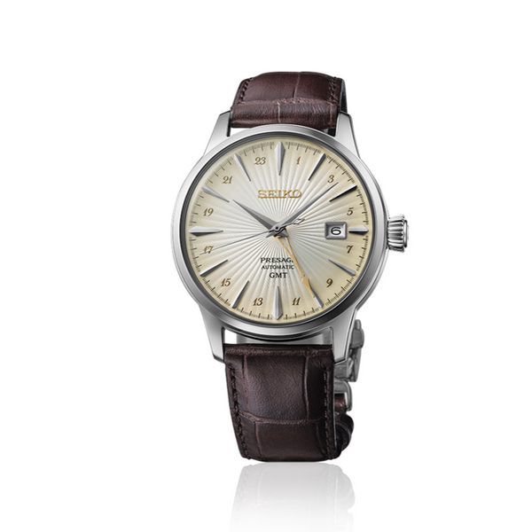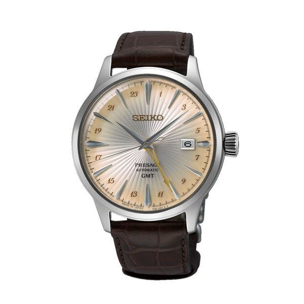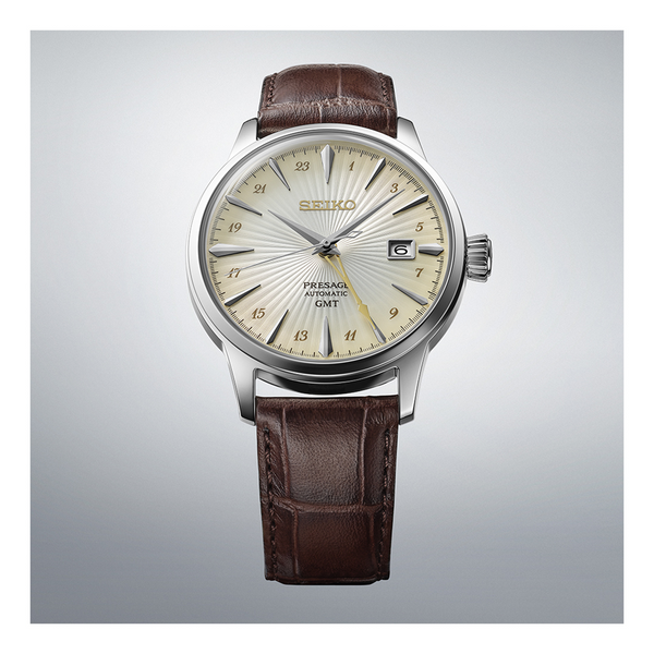 Gent's Seiko Presage Cocktail Time GMT Automatic Watch. The 40.5mm case is stainless steel and the strap is brown leather with a deployment clasp. The dial is champagne in colour with GMT 24 hour and date functions. The watch has a see-through case back. The movement is automatic.