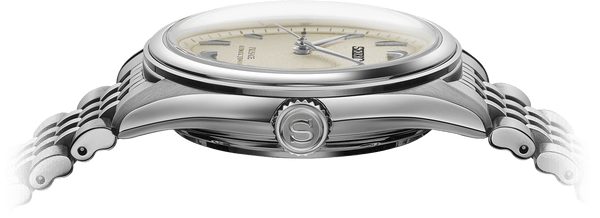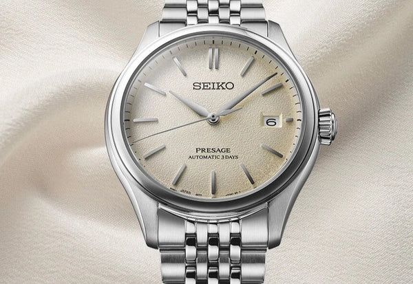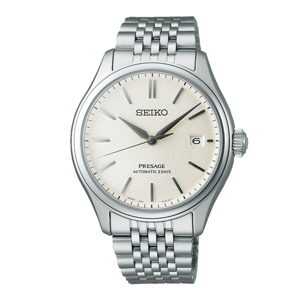 Gents Seiko Presage Classic Automatic Watch. The 40.2mm case and bracelet are stainless steel. The dial is off-white with a textured pattern and a date function. The watch has a curved sapphire crystal glass, a see-through case back and is 100m water resistant. The movement is automatic with a 3-day power reserve. Currently out of stock.