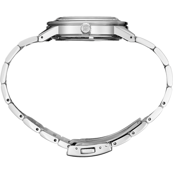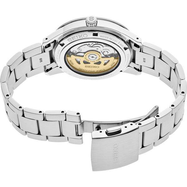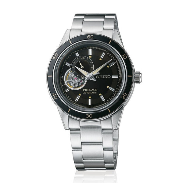 Gent's Seiko Presage Automatic Watch.  The 40.8mm case and bracelet are stainless steel, the dial and bezel are black and the glass is hardlex crystal.  The watch features a window on the dial revealing the automatic movement, a 24 hour hand indicator sub dial, and a see-through case back. Currently out of stock.