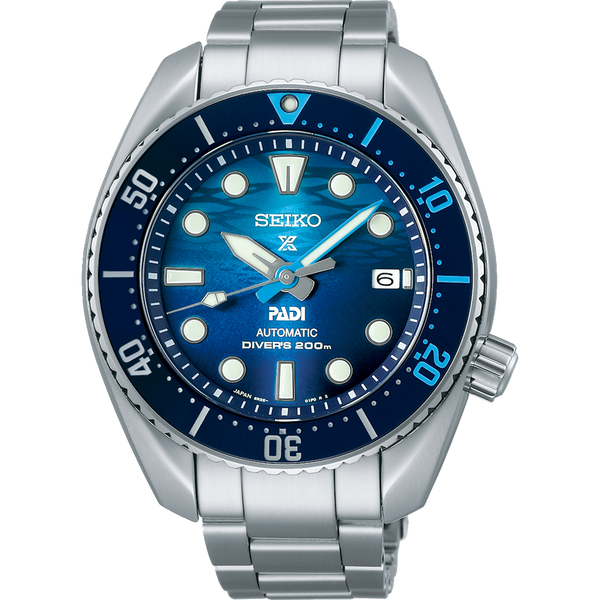 Gent's Seiko Prospex Divers P.A.D.I. Special Edition Automatic Watch. The 45mm case and bracelet are stainless steel. The dial is blue with a wave pattern, and the bezel is blue ceramic. The glass is sapphire crystal. The watch has a date function and is 200 metres water resistant. The movement is automatic. Presented in a special box.