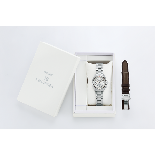 Gent's Seiko Prospex GMT 110th Anniversary of Watchmaking Limited Edition Automatic Watch. The 39.5mm case and bracelet are stainless steel. The dial is white with an inner bezel compass ring. The stainless steel bezel has 24 hour time markers. The watch has a GMT hand to set to a different time zone. The watch has a sapphire crystal glass, see-through case back, date function and is 200m water resistant. The movement is automatic. Presented in a special box with an additional brown leather strap with a deployment clasp. One of 3000 pieces worldwide. Currently out of stock.