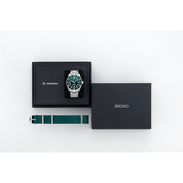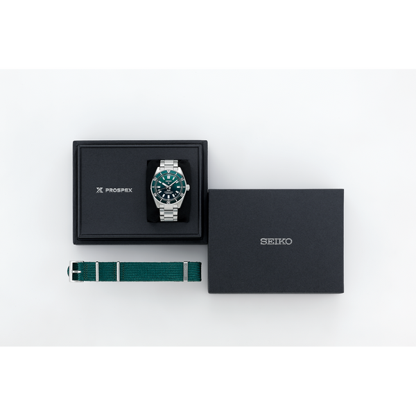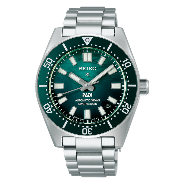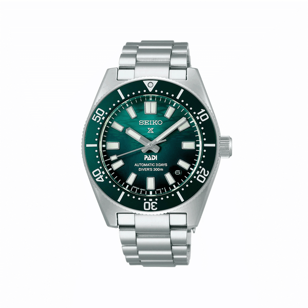 Gent's Seiko Prospex 1965 Heritage Diver’s PADI Special Edition Automatic Watch. The 40mm case and bracelet are stainless steel. The dial is a gradient green colour with a wave pattern and date function. The bezel is green and the glass is sapphire crystal. The watch is 300 metres water resistant and the movement is automatic. Presented with an additional green Nato style strap.