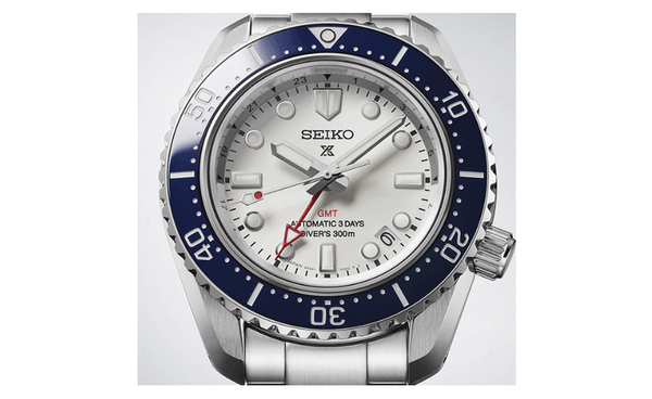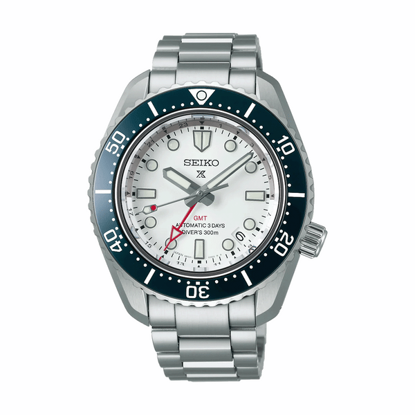 Gent's Seiko Prospex 1968 Heritage Diver's G.M.T Automatic Watch. The 42mm case and bracelet are stainless steel and the ceramic bezel is blue. The dial is white with a date function. The watch has a G.M.T hand that can be set on a second time zone. The glass is sapphire crystal, and the watch is 300 metres water resistant. The movement is automatic. Three year Seiko international warranty.
