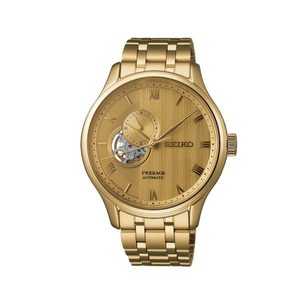Gents Seiko Presage Japanese Garden Automatic Watch. The 41.8mm case and bracelet are yellow gold PVD on stainless steel. The dial is gold with a textured pattern, gold coloured roman numerals and hands, 24-hour indicator sub-dial and circlular shaped movement window. The watch has a sapphire crystal glass with a see-through case back. The movement is automatic.