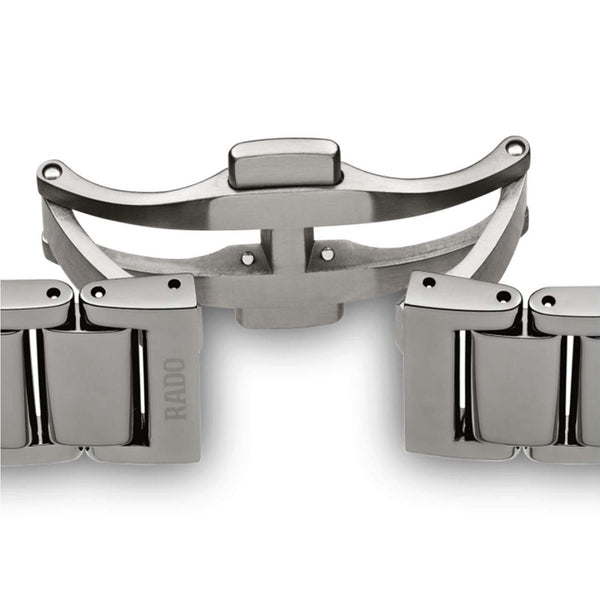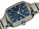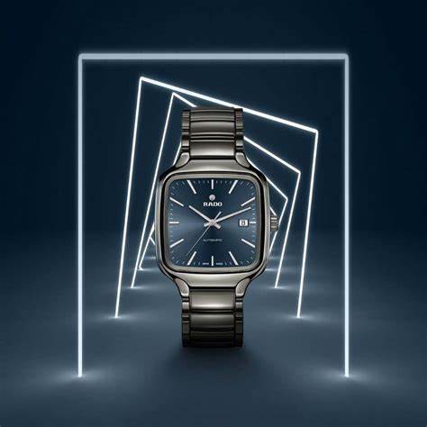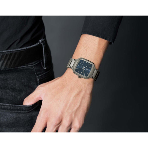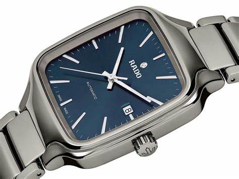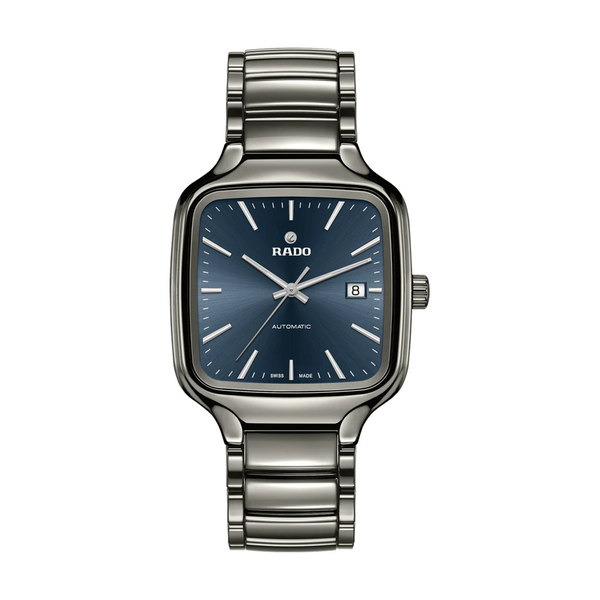 Gent's Rado True Square Automatic Watch. The square shaped 38mm case and bracelet strap are plasma high tech ceramic. The watch features a blue dial and date at 3 o'clock. The glass is sapphire crystal and the movement is automatic. Currently out of stock but available to order.