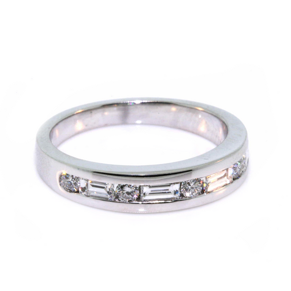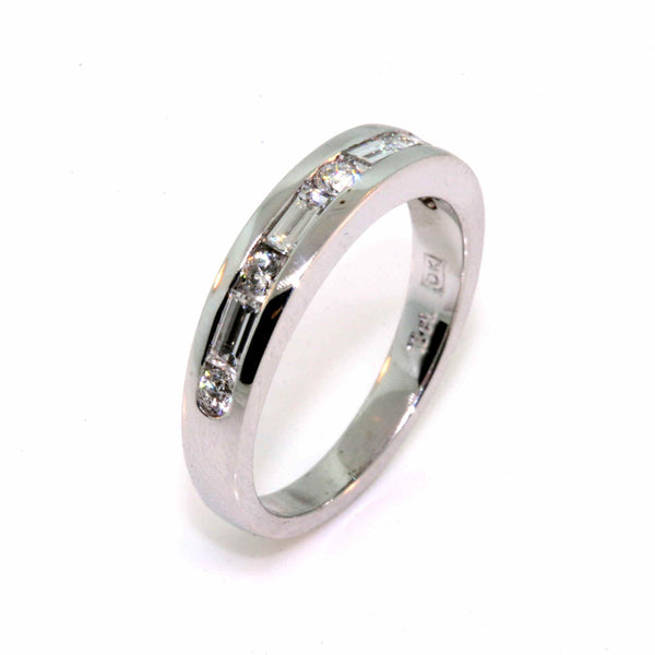 Ladies custom-made 18k white gold diamond set wedding ring. The ring is set with 0.40cts of baguette cut and 0.20cts of round brilliant cut diamonds, quality FG / VS-SI1. This design is made to order in the required finger size.  Pricing is based on size L-M.