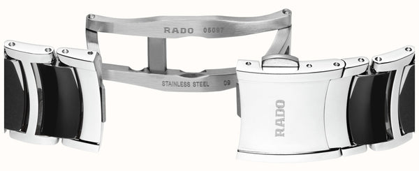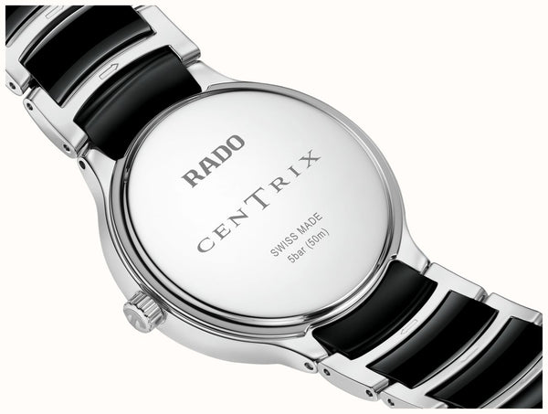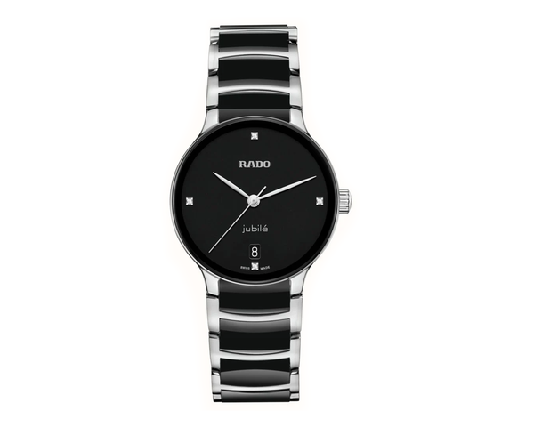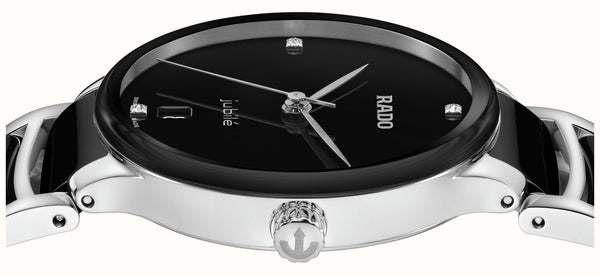Ladies Rado Centrix Quartz Watch. The 35mm case is stainless steel. The bracelet is bicolour: stainless steel with black high tech ceramic centre links. The dial is black with 4 diamond set hour markers and a date function. The glass is sapphire crystal. The movement is quartz.