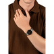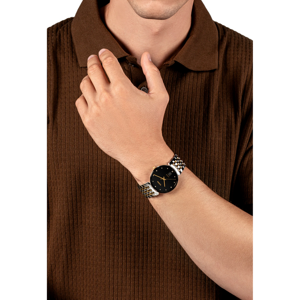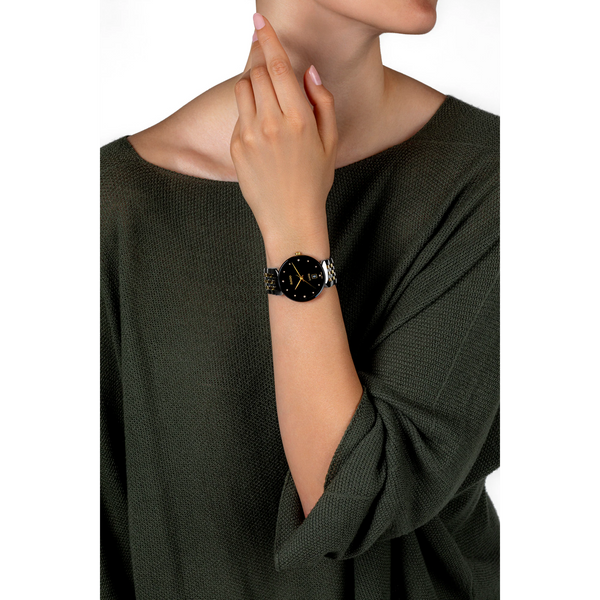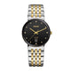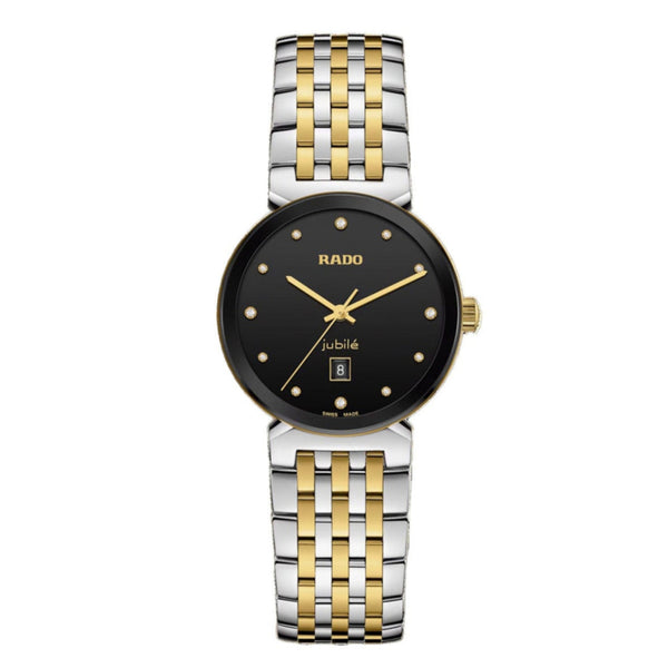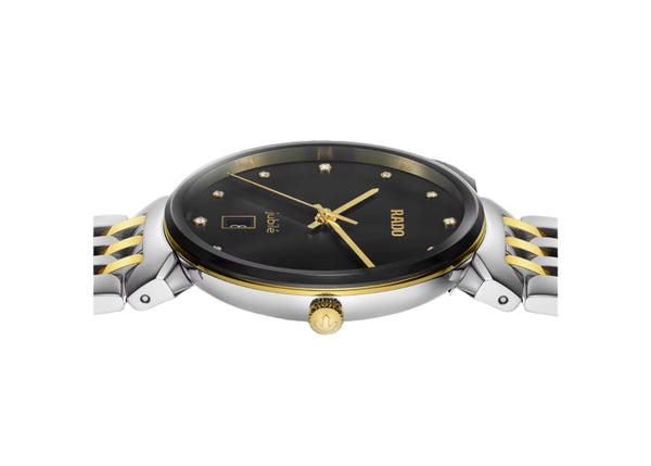Rado Florence Classic Quartz Watch. The 38mm case and bracelet are bicolour: yellow gold PVD and stainless steel. The dial is black with twelve diamond set hour markers and a date function. The glass is sapphire crystal. The movement is quartz.