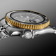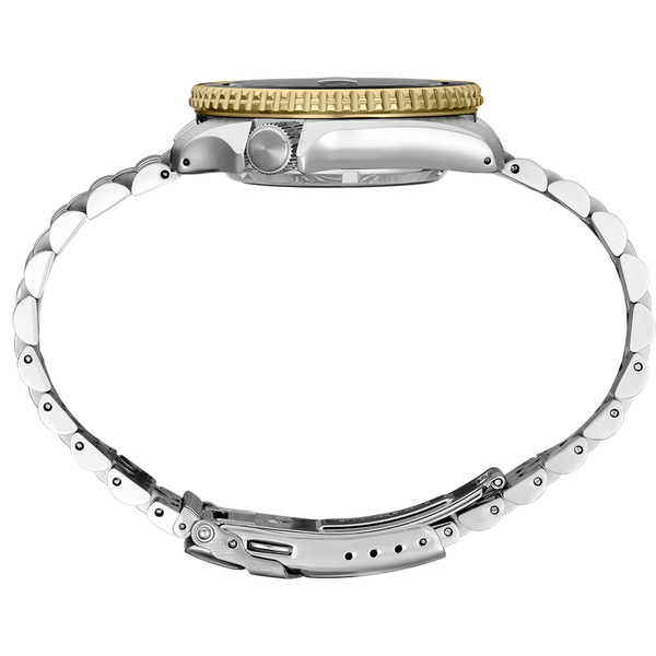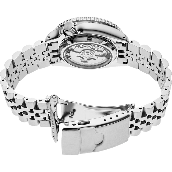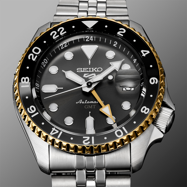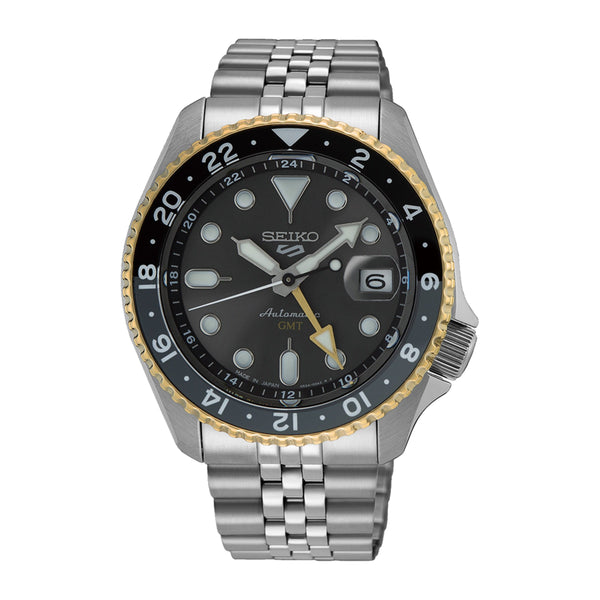 Gent's Seiko 5 Sports Automatic GMT Watch. The 42.5mm case and bracelet are stainless steel with a bicolour black and gold PVD 24-hour GMT bezel. The dial is charcoal grey, and the watch has a GMT hand and a magnified date window. The watch has a see-through case back and is 100 metres water resistant. The movement is automatic.