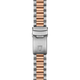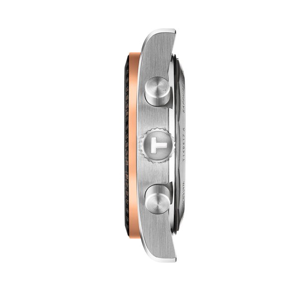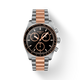 Gent's Tissot PR516 Quartz Chronograph Watch. The 40mm case and bracelet are bicolour: rose gold PVD and stainless steel. The mineral bezel is black with a tachymeter. The dial is black with PVD rose gold accents and three sub-dials. The glass is sapphire crystal. The watch features a chronograph function and is 100 metres water resistant. The case back is engraved. The movement is quartz.