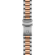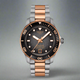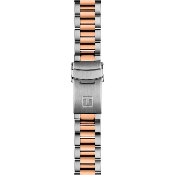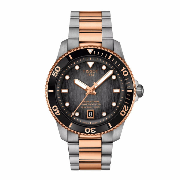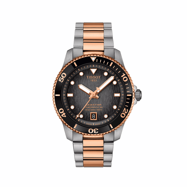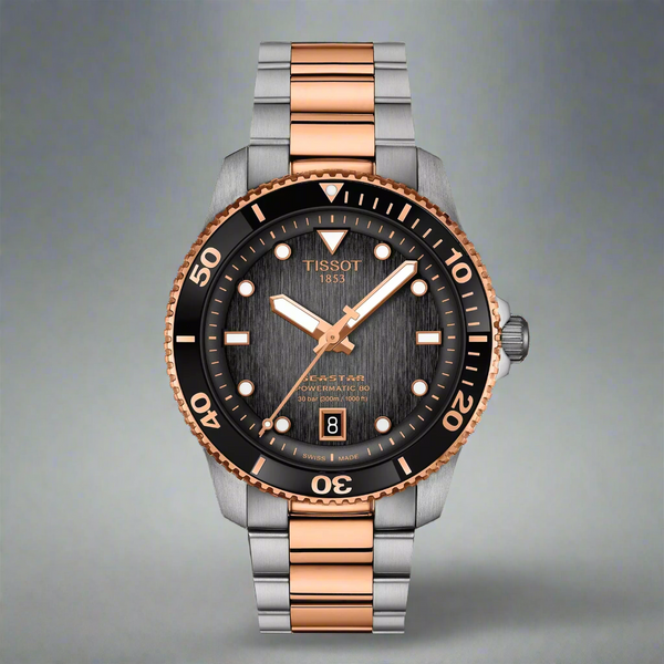 Gent's Tissot T-Sport Seastar 1000 Powermatic 80 Watch. The 40mm case and bracelet are bicolour: rose PVD and stainless steel with a black mineral and rose gold PVD bezel. The dial is graded grey to black and has a date function. The glass is sapphire crystal. The watch has a see-through case back and is 300 metres water resistant. The movement is an automatic Powermatic 80.