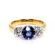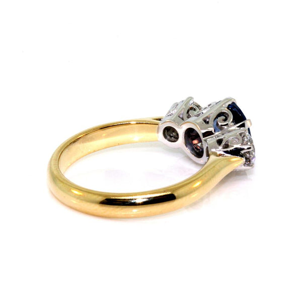 From our workshop, an18k yellow and white gold sapphire and diamond trilogy ring. The ring is set with a 1.5ct round Ceylonese sapphire, measuring 6.3mm, and 0.80cts (in total) of round brilliant cut diamonds, FG colour, SI1-2 clarity.