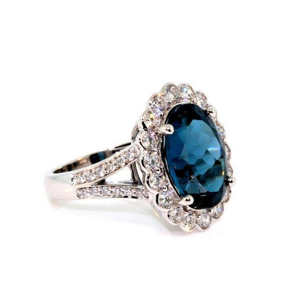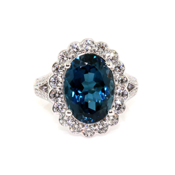 Platinum London Blue Topaz and Diamond Cluster Ring. The ring is set with an 8ct oval London Blue Topaz measuring 14 x 10mm and 1.40cts (in total) of round brilliant cut diamonds, GH colour and SI1-2 clarity.
