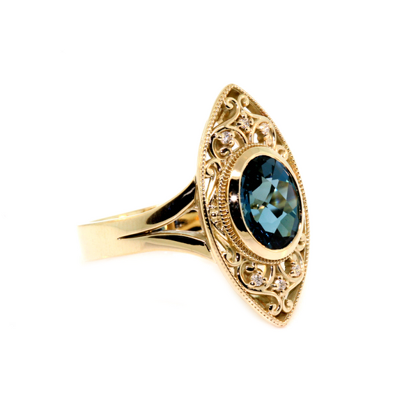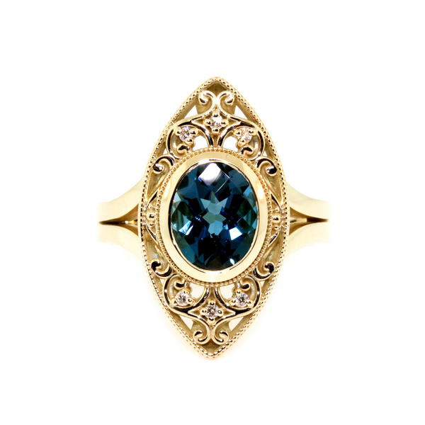 10k yellow gold art deco style London blue topaz dress ring. The ring is set with a 3.3ct oval London blue topaz measuring 10 x 8mm, and 0.06cts of round brilliant cut diamonds, FG colour, VS-SI1 clarity.