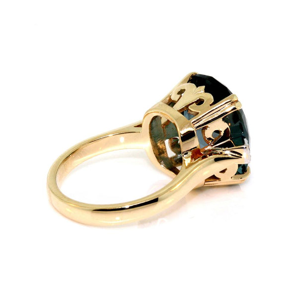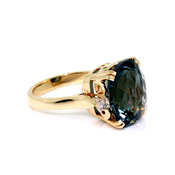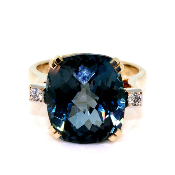9k yellow gold dress ring set with a 10.4ct chequerboard cut cushion shaped London blue topaz and two 0.03ct round brilliant cut diamonds, quality FG / VS-SI1.