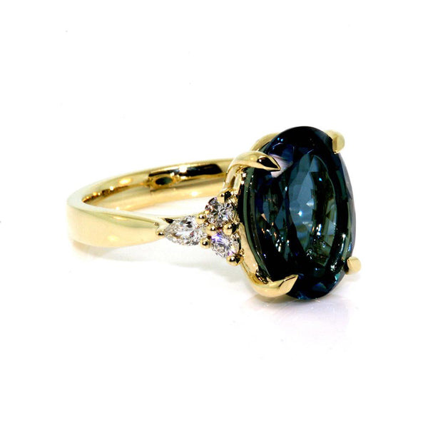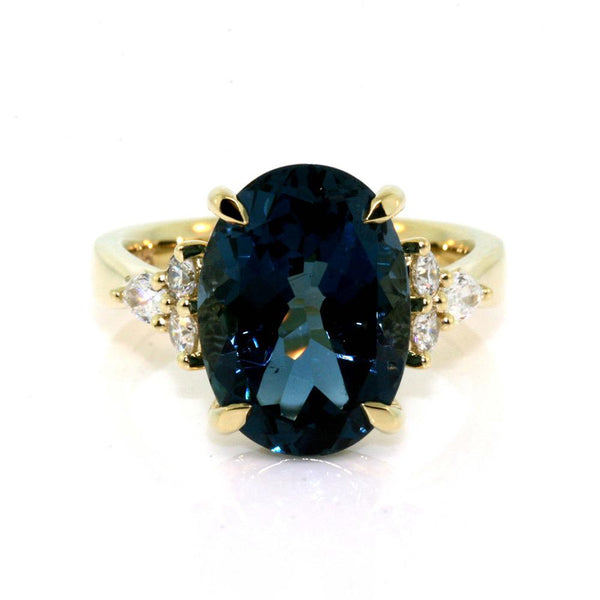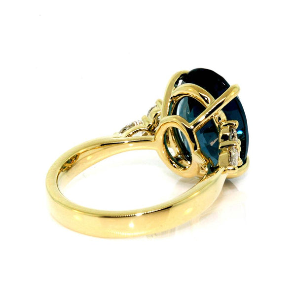 Custom-Made 14k Yellow Gold London Blue Topaz and Diamond Dress Ring. The ring is set with a 7ct oval London Blue Topaz and 0.38cts of pear shaped and round brilliant cut diamonds, quality FG / SI1-2. This ring is made to order in the required finger size.