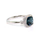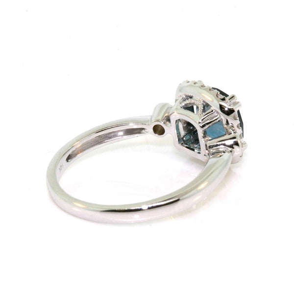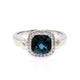 14k White Gold London Blue Topaz and Diamond Dress Ring. The ring is set with an 1.8ct chequerboard cut cushion shaped London blue topaz and 0.20cts of round brilliant cut diamonds, GH colour and SI clarity.