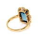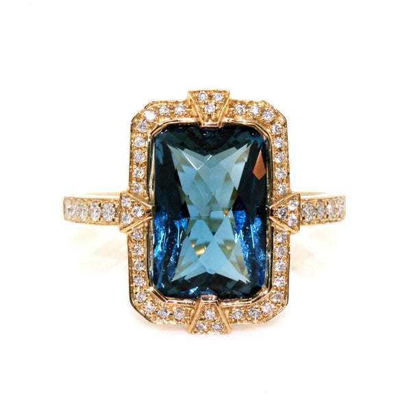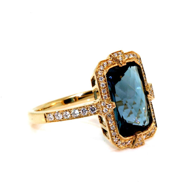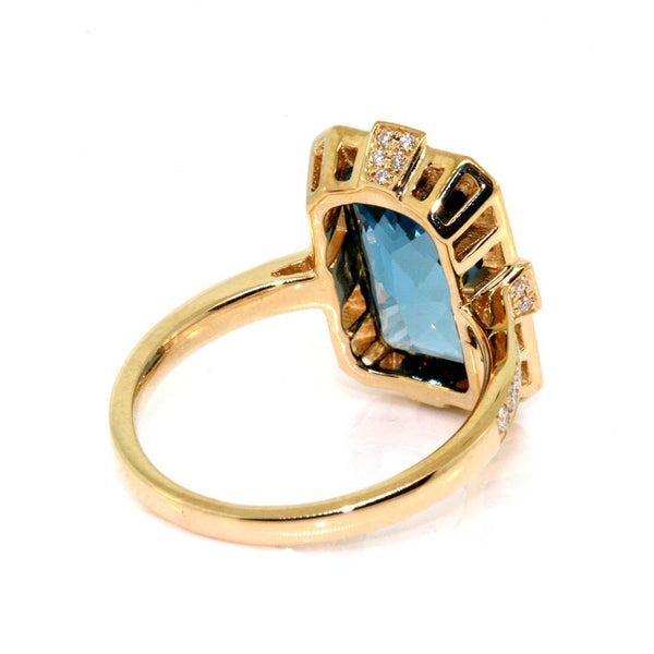 14k Yellow Gold London Blue Topaz and Diamond Dress Ring. The ring is set with a 5.16ct chequerboard cut cushion shaped London blue topaz and 0.30cts of round brilliant cut diamonds, quality GH / SI-I1.
