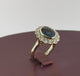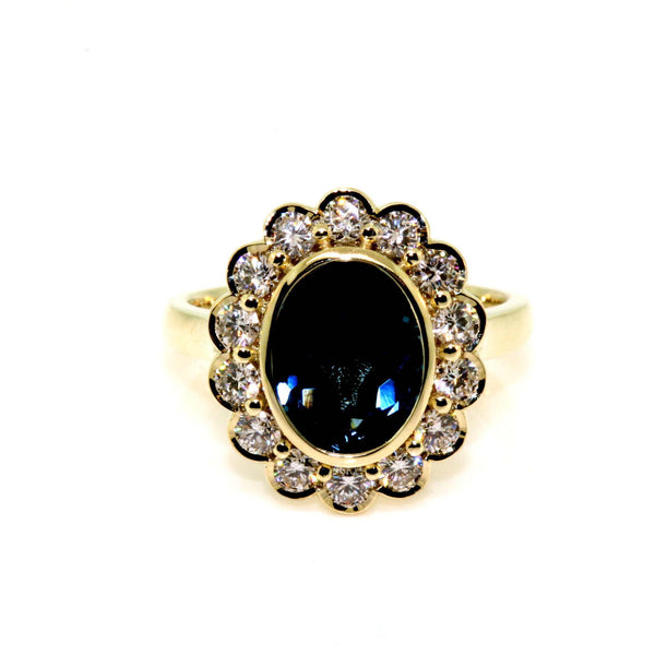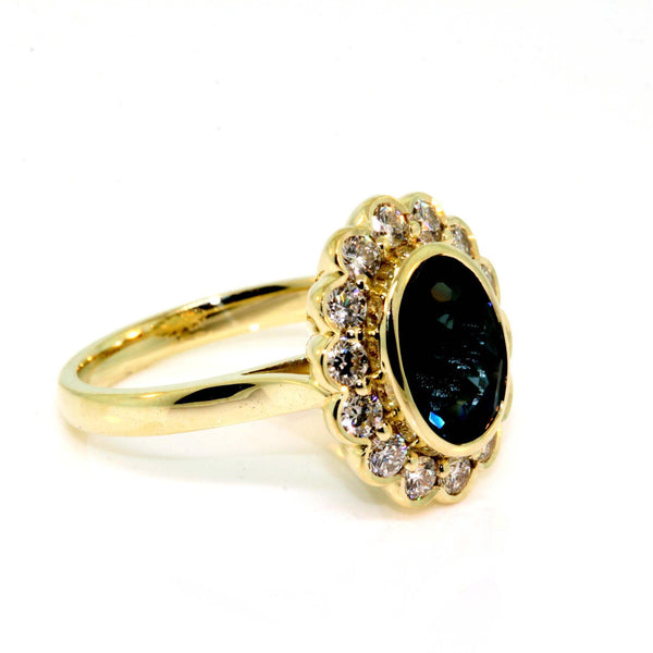 9k Yellow Gold London Blue Topaz and Diamond Cluster Dress Ring. The ring is set with a 10 x 8mm 3ct oval London Blue Topaz and 0.91cts of round brilliant cut diamonds, quality FG / VS-SI1.